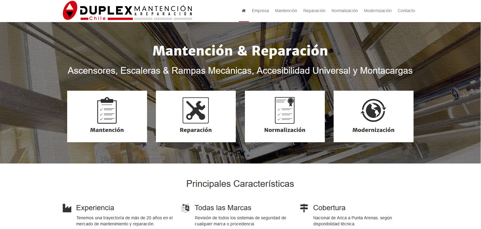 Duplex Mantención es un departamento exclusivo de Duplex S.A., dedicado principalmente a la "Mantención Preventiva de Ascensores, Escaleras & Rampas Mecánicas, Equipos de Accesibilidad Universal y Montacargas", de Todas las Marcas y Modelos disponibles en el mercado, junto a otros servicios de asesorías e ingeniería.